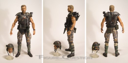 Hicks is perhaps one of my favorite movie characters of all time, so by that grace, he gets to go first.  If you’ve read my two prior Hicks reviews, you’ll know that this figure stands about 7 inches tall and has 30 points of articulation.  You’ll also know that I’m a pretty big fan of the sculpt, particularly the body.  None of that has changed, apart from the body having slightly sturdier joint construction this time.  This figure has both the un-helmeted and helmeted heads of the single and double-pack versions of the character.  Of the two, my favorite is definitely the un-helmeted head.  It’s more calm expression works better for the character, and lends itself to a more recognizable Beihn likeness.  The helmeted head is okay, but I don’t care for the screaming expression, and I feel the helmet sits a bit too high.  The real, important difference on this figure is the paint.  While it’s just cleaner in general, the major deviation is how the skin has been handled.  The Series 1 figures hit at a transition point for NECA, as they moved from painted to molded skin tones, and due to the size of the production and costs associated, the Series 1 Marines had painted skin.  It was far from awful, but later figures, most notably the recent Ripley and Vasquez figures, had the molded skin.  For the re-releases, NECA’s brought Hicks inline with the newer figures.  It’s really just a simple change on their part, but it makes for a major change in the quality of the figure.  The likeness on both heads is greatly improved by the lack of extra paint, and he looks far more lifelike in general, thanks to how the light hits plastic vs. how it hits paint.  In addition to the pair of heads, Hicks has his M41A pulse rifle, his shotgun for “close encounters,” a holster for the shot gun, a motion tracker, and a removable shoulder lamp.  Most of these pieces are identical to the original releases, but the shoulder lamp has been tweaked to make it much easier to get it placed on his back (a huge issue with the original figures).