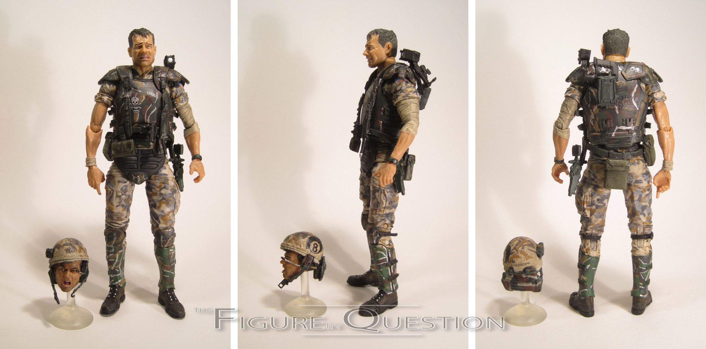 Okay, I feel a little bad for Hudson, having just proclaimed Hicks one of my favorite characters of all time.  It’s okay Hudson, I still like you too!  When I reviewed the original figures, I had some issues with Hicks, but for the most part I was pretty solidly happy with both versions of Hudson.  This guy is essentially the same: about 7 inches tall, 30 points of articulation, and a pretty kickass sculpt.  Like Hicks, he has both helmeted and un-helmeted heads.  Unlike Hicks, I don’t really have a favorite of the two, since I find the likeness on both to be pretty solid, and the issue with the high sitting helmet is avoided.  He’s got the same tweaks to the paint as Hicks; everything is sharper overall (though there was a bit of errant paint on his un-helmeted head), and he’s got the new molded skin tone.  If I thought the figures were good before, there’s really no topping them here.  Hudson gets one more tweak on the helmeted head; the original helmet detailing was rather generic, and was missing Hudson’s character-specific graffiti.  This figure adds that back in.  It’s one of those things you don’t realize you miss until you see it, and then you really can’t un-see it.  Now the older figure just looks wrong (I mean, he always was, but now it’s a more nagging wrong-ness).  Hudson has the M41A pulse rifle, motion tracker, and removable shoulder lamp.
