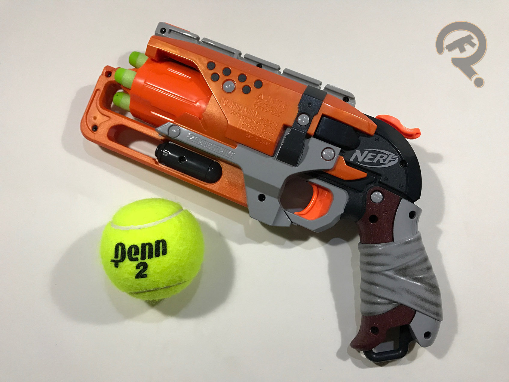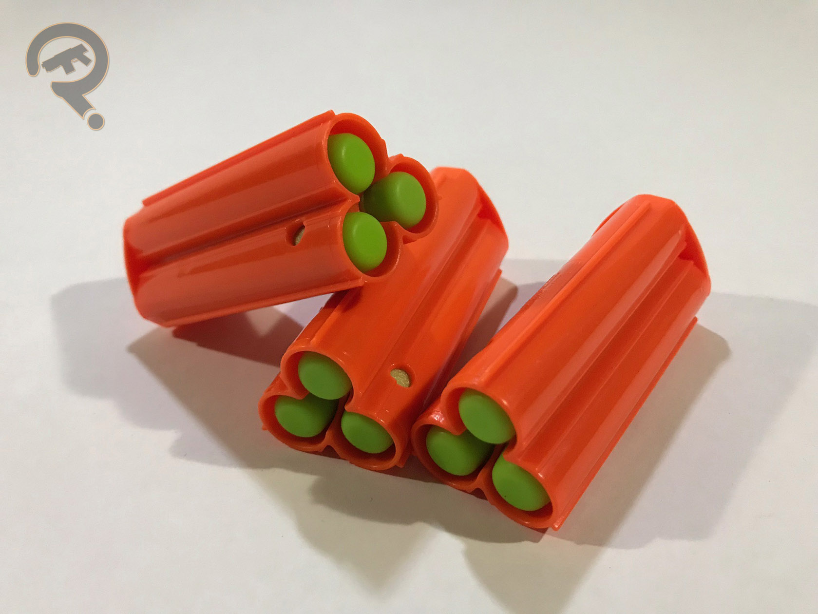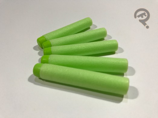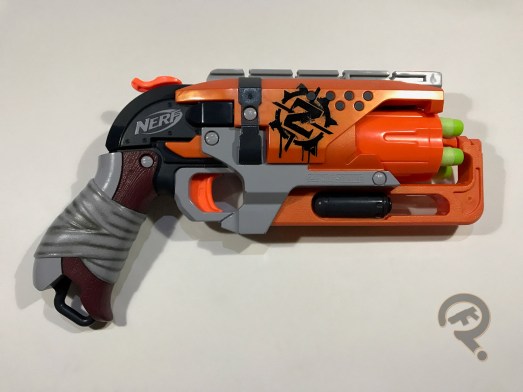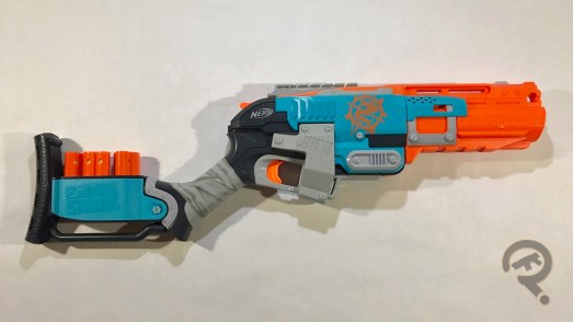 reloading. Now with the Nailbiter, not only does the clip fit entirely within the silhouette of the blaster, but when it’s ratcheted all the way up, you can reload all 8 barrels. At this rate, in a few more iterations, it’ll hold 200 rounds and have 30% critical chance. Nerf, I’m serious, pick up the Warframe license. I’ll buy everything. Anyway, being a double-action blaster, pulling the trigger not only primes and fires in a single stroke, now it also advances the clip. This makes rapidly firing very easy, especially while dual weighing which I highly recommend if you can manage it. The Nailbiter is fairly large for a pistol. It was certainly bigger than I was expecting. On the plus side, that larger size means that it was big enough to include a stock and barrel attachment point. There’s also a rail on the bottom for… something, Australian scopes? Who knows? The performance of the Nailbiter isn’t the most amazing in terms of range and power, but it’s definitely respectable in those regards. As I said earlier, the main draw for a blaster like this is rapid fire. Busting into your younger siblings’ room with two Nailbiters and opening fire is a sight they’ll not soon forget. The Nailbiter comes packaged with 8 Zombie Strike Elite darts.
